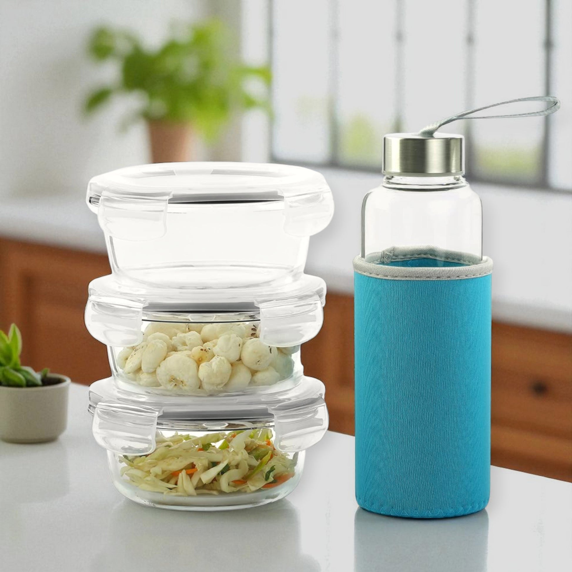 Clear Borosilicate Glass Lunch Box Set – 3 PC Round 400ml + 1 Bottle | Microwave Safe, Glass Lunch Box for Office Use