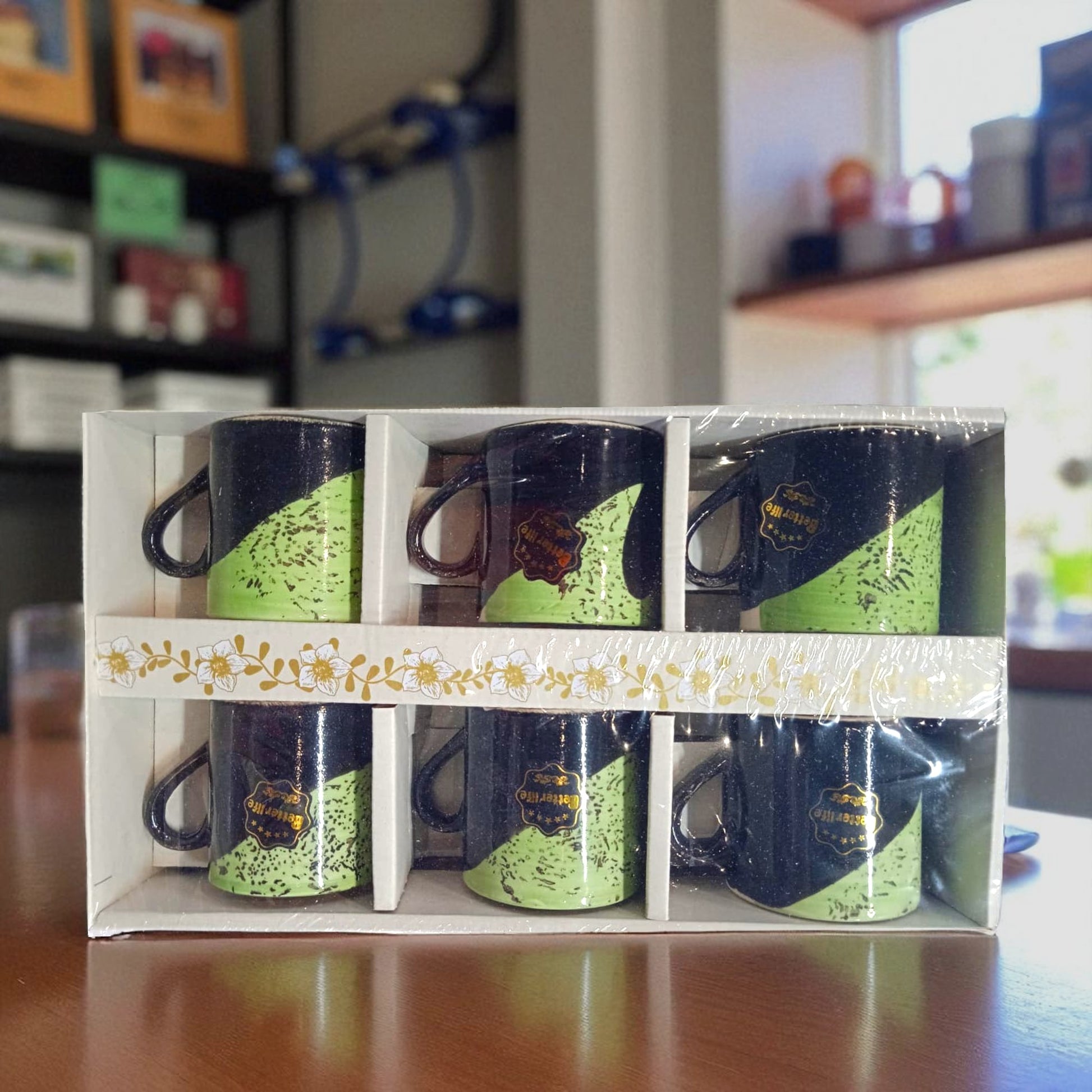 Set Includes: 6 ceramic tea/milk cups and 3 matching serving bowls.
