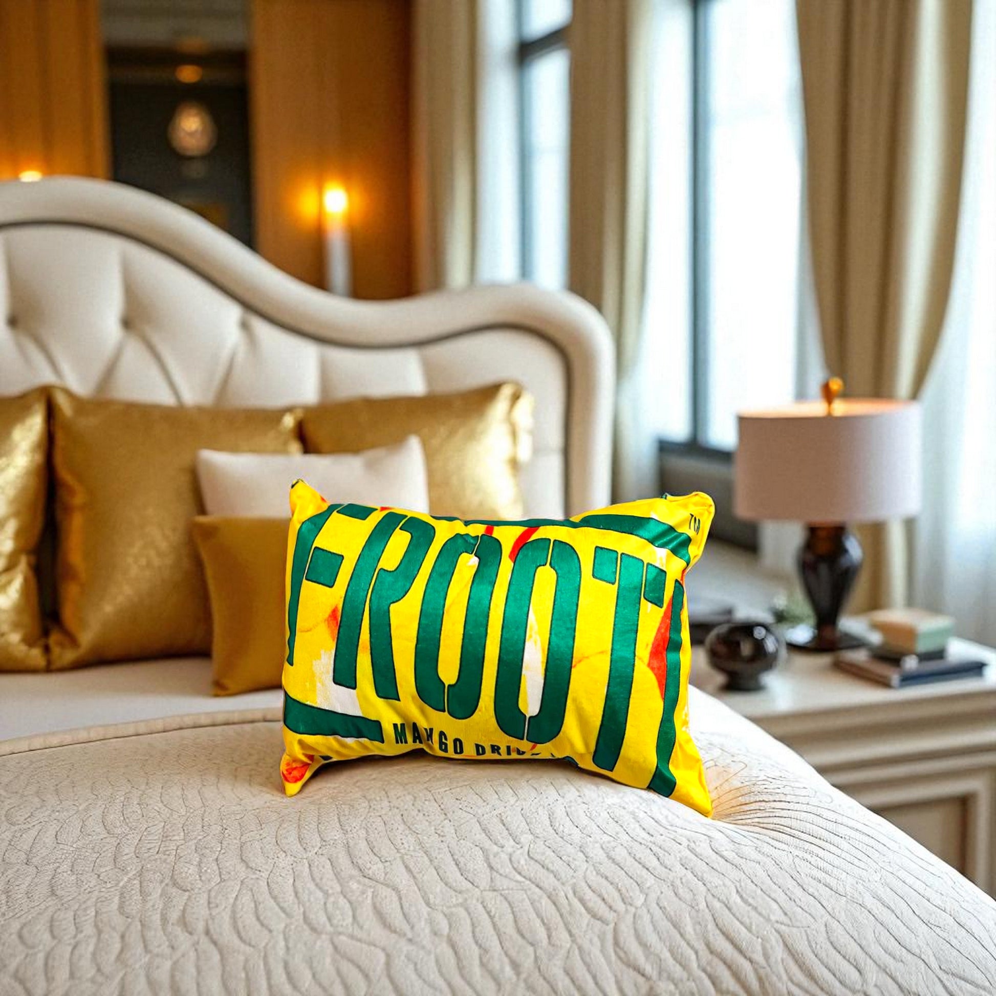 Bring home a splash of fun and comfort with the vibrant Frooti Pillow, a playful and extra soft pillow for kids. Inspired by the iconic mango drink, this yellow Frooti-themed throw pillow features a cute rectangular shape and is designed with children in mind.