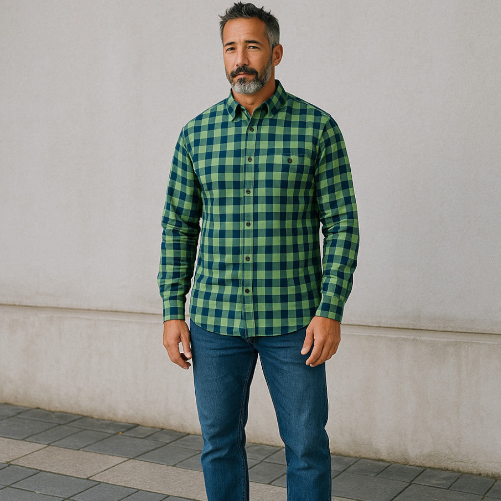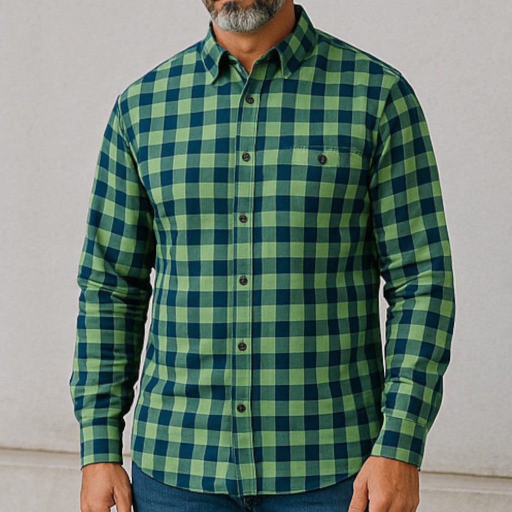 Men's Check Shirt – Green-Blue Raised Collar Regular Fit | Stretchable Full Sleeves