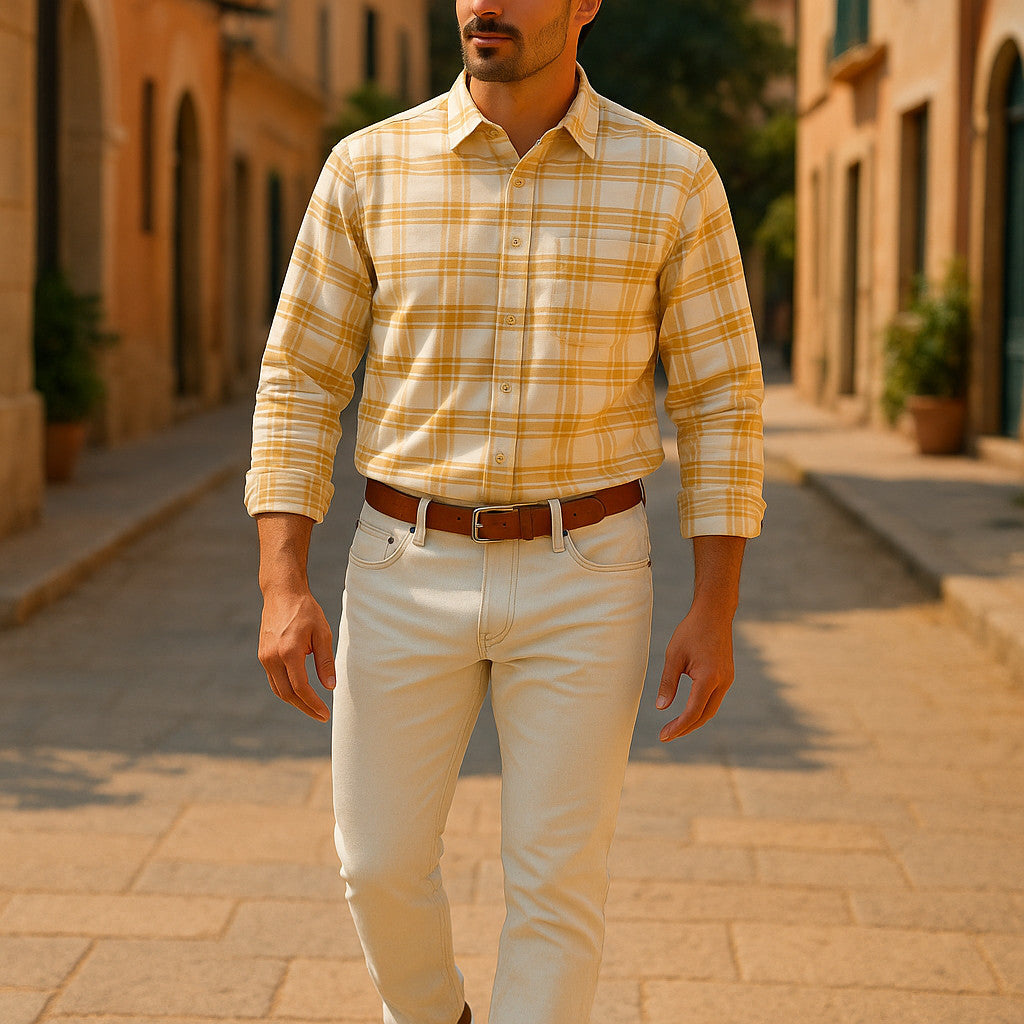 Men's Check Shirt –Yellow White Slim Fit with Raised Collar | Stretchable Long Sleeve