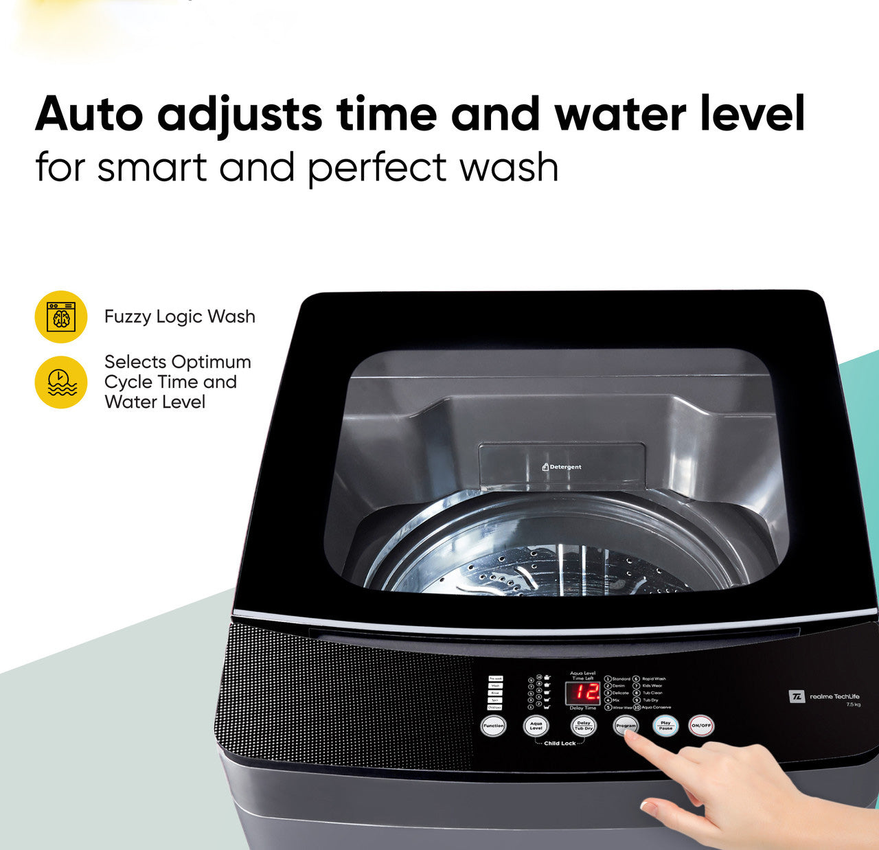 realme techlife washing machine is designed for modern households that value performance, fabric care, and efficiency. This realme washing machine 7.5 kg model features fully automatic top load functionality and a powerful pulsator wash method, making laundry care effortless and effective.