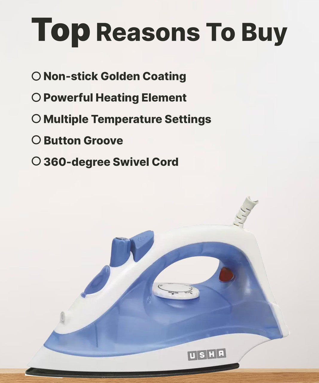 Get crisp, wrinkle-free clothes with the USHA SI 3713 1300 W Steam Iron (Blue). Designed for powerful performance and convenience, this Usha steam iron combines advanced features with a sleek design for smooth ironing.